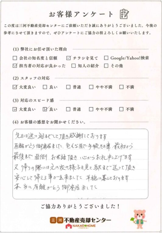 先日は送り迎までしていただき感謝しております。有難がとう御座いました。色んな面で手続きの事、最初から最後まで面倒お世話頂き、心からお礼申し上げます。又帰りの際には元の家の様子を見て、駅まで送って頂き、安心して帰る事が出来ました。平穏に暮らしております。本当に有難う御座いました。