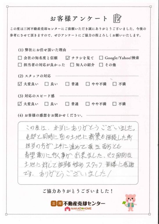 実家が空き家になり、私弟共に県外に居を設けているため、実家を売却することになった。売却先を探していたが、自身の会社の関連会社の不動産会社に依頼してみたものの、実家の間口が狭く購入を希望する先が見つからないまま月日だけ過ぎてしまっていました。そんな状況が一変したのが今回売却をお願いすることになりましたナカオホームさんでした。親戚が数年前に間口が狭い土地であっても対応して下さったことを知り、ナカオホームさんを選択させていただきました。テレビでやっている狭小住宅の“突破ファイル”さながらアメージングでした。