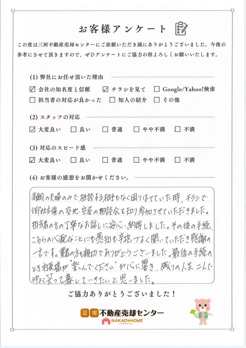 高齢の夫婦のみで相談する相手もなく困り果てていた時、チラシで御社主催の空地・空屋の相談会を知り参加させていただきました。担当者の方の丁寧なお話に安心、納得しました。その後の手続き、こちらの心配なことにも愚痴も辛抱強く聞いていただき感謝の一言です。業者の方も親切でありがとうございました。最後の手続きの時社長様が“楽しんで下さい”が心に響き、残りの人生二人で仲よく笑って暮らしていきたいと思いました。