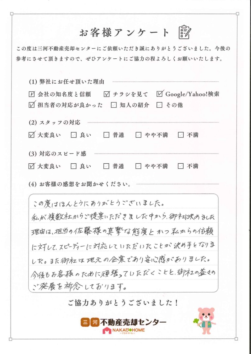 この度はほんとうにありがとうございました。私が複数社からご提案いただきました中から、御社に決めました理由は、担当の佐藤様の真摯な態度とかつ私からの依頼に対して、スピーディーに対応していただいたことが決め手となりました。また御社は地元の企業であり安心感がありました。今後もお客様のために頑張っていただくことと、御社の益々のご発展を祈念しております。