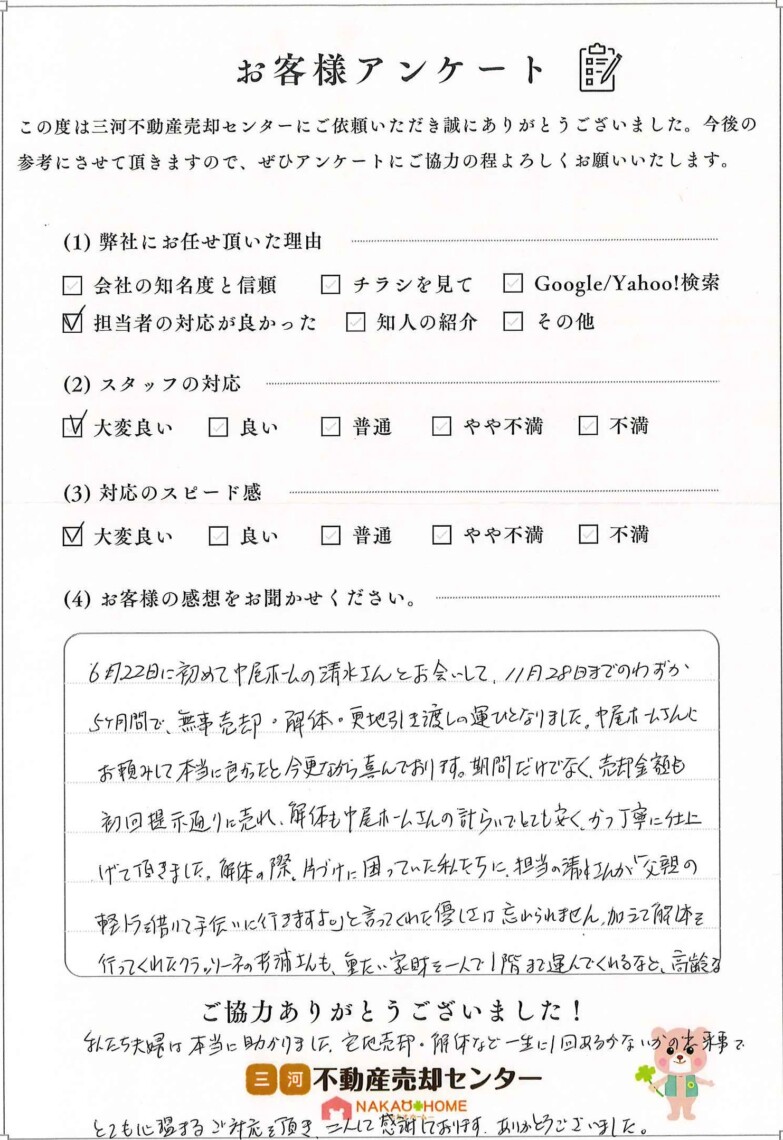 6月22日に初めて中尾ホームの清水さんとお会いして、11月28日までのわずかな5ヶ月間で、無事売却・解体・更地引き渡しの運びとなりました。中尾ホームさんにお頼みして本当に良かったと今更ながら喜んでおります。期間だけではなく、売却金額も初回提示通りに売れ、解体も中尾ホームさんの計らいでとても安くかつ丁寧に仕上げて頂きました。解体の際、片づけに困っていた私たちに、担当の清水さんが『父親の軽トラを借りて手伝いに行きますよ。』と言ってくれた優しさは忘れられません、加えて解体を行ってくれたクラッソーネの杉浦さんも重たい家財を1人で1階まで運んでくれるなど、高齢な私たち夫婦は本当に助かりました。土地売却・解体など一生に1回あるかないかの出来事でとても心温まるご対応を頂き、二人して感謝しております。ありがとうございました。