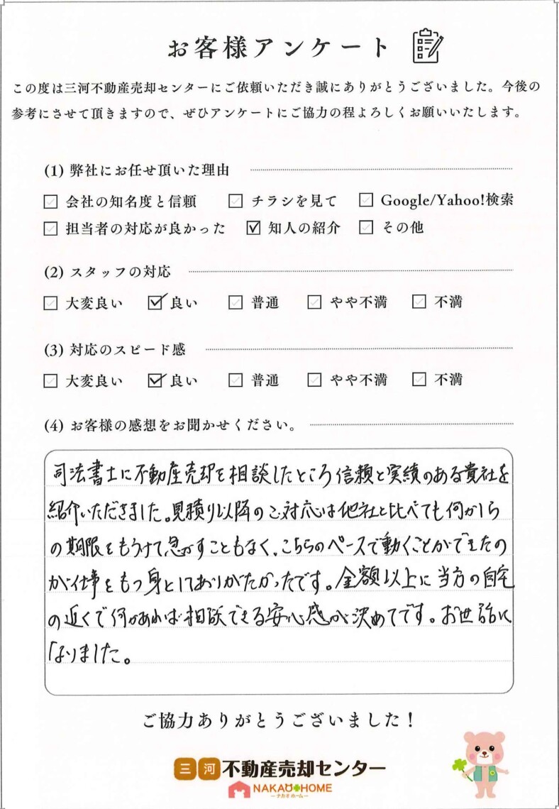 司法書士に不動産売却を相談したところ、信頼と実績のある貴社を紹介いただきました。見積もり以降のご対応は他社と比べても何かしらの期限をもうけて急かすこともなく、こちらのペースで動くことができたのが仕事を持つ身としてはありがたかったです。金額以上に当方の自宅の近くで何かあれば相談できる安心感が決め手です。お世話になりました。